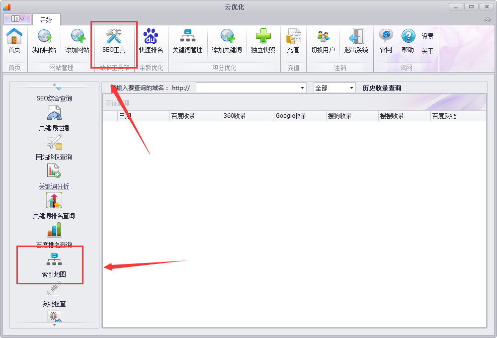 首先打开“云无限”软件。,点击“SEO工具”,之后点击软件左侧“索引地图”