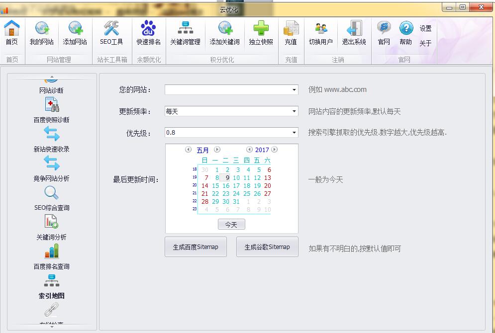 输入你要生成Sitemap文件的网址,只需选择更新频率,其他的不用管,一般选择每天或者每周。 并点击“生成百度Sitemap”。将保存路径放到桌面上,便于上传。